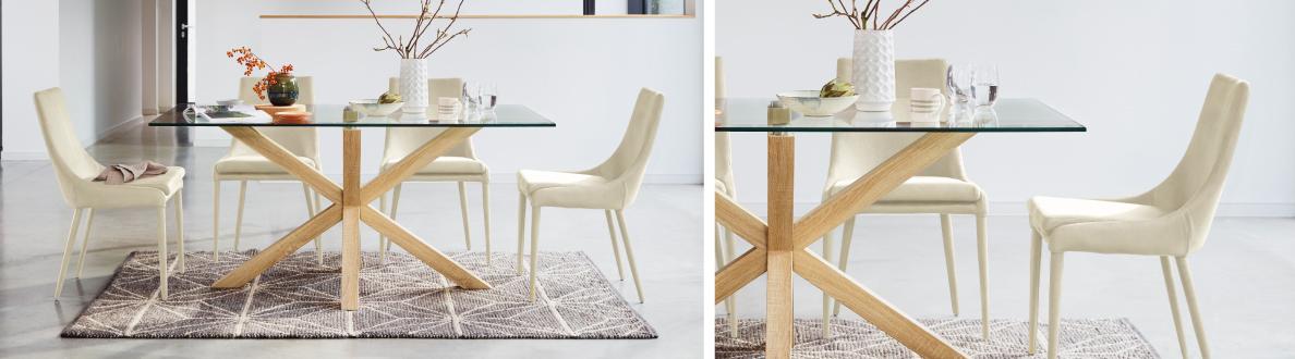 Make a statement with the Evoque dining collection, perfect for lovers of bold, ultra-modern design. The glass topped tables with striking starburst design legs are available in two sizes with three attractive base finishes. Complete with your favourite from two different styles of luxuriously comfortable contemporary dining chair, in a choice of three colours. High-end designer style, without the high-end price tag.